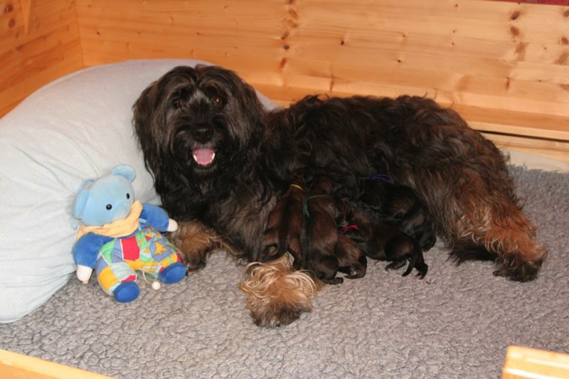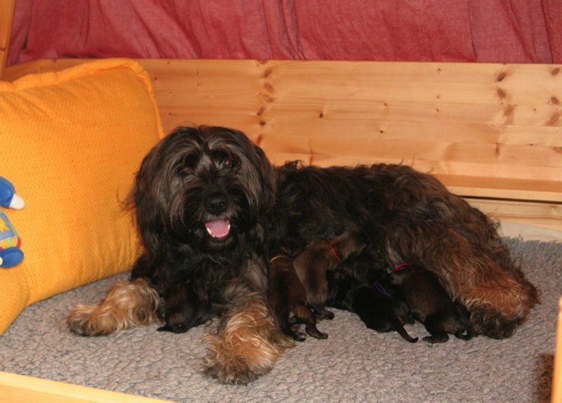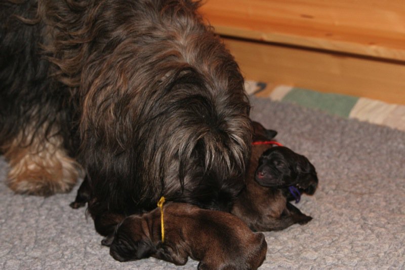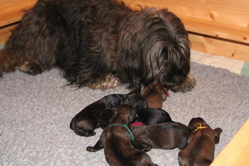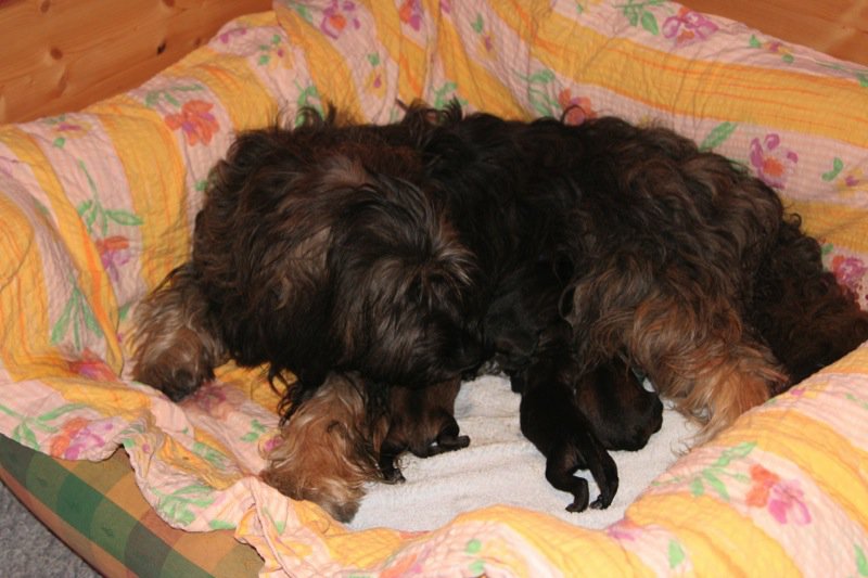 Der Kompromiss war, dass das Bettchen mit in die Wurfhöhle musste, und so bekam sie ihre Welpen eben dort. Gegen 05:30 Uhr kann die erste Hündin und gegen 09:00 Uhr der letzte Rüde. Alle sind putzmunter und um die 400g schwer. Jetzt liegen sie alle mauzend und schmatzend an und auf Cobold. Einige von ihnen haben schon jetzt erkennbar deutliche Tendenzen zu Bergsteigern ... liegen sie, egal wo Cobold und ich sie hinlegen, immer oben auf Cobold.