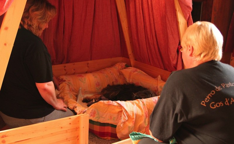Wir hatten uns eigentlich so auf Donnerstag oder Freitag eingestellt, aber Cobold wollte ihren dicken Bauch nicht mehr länger mit sich herumschleppen. Dienstag morgen gegen 03:00 Uhr wurde sie immer unruhiger, so dass wir aus dem Schlafzimmer (alle drei Gossos hinterher) ins Wohnzimmer zur Wurfhöhle umgezogen sind. Cobold wollte mir schon Tage vorher mehr oder weniger 'einleuchtend' verklickern , dass eine Geburt unter den völlig verwachsenen Wachholdersträuchen das Non Plus Ultra sei. Leider ist der Eingang zur ihrem selbstgebauten Nest nicht wirklich für einen Menschen zugänglich, so dass ich ihr leider klarmachen musste, das dieser an sich wunderschöne Platz ein absolutes 'No Go' ist. Auch die danach offerierte und schnell neu gestaltete Mulde im dichtesten Hexenhofgestrüpp wurde von mir abgelehnt. Sie wird jetzt wohl eine Klage beim Tierschutz einreichen, aber bis dahin habe ich mich mit der Wurfhöhle im Wohnzimmer eindeutig durchgesetzt.