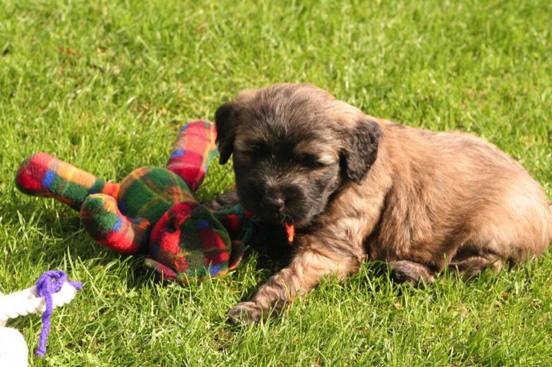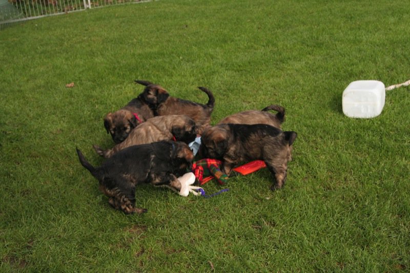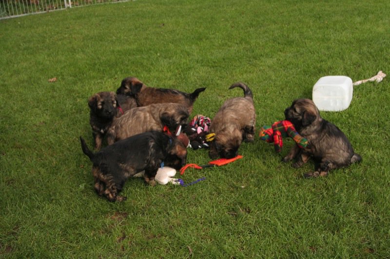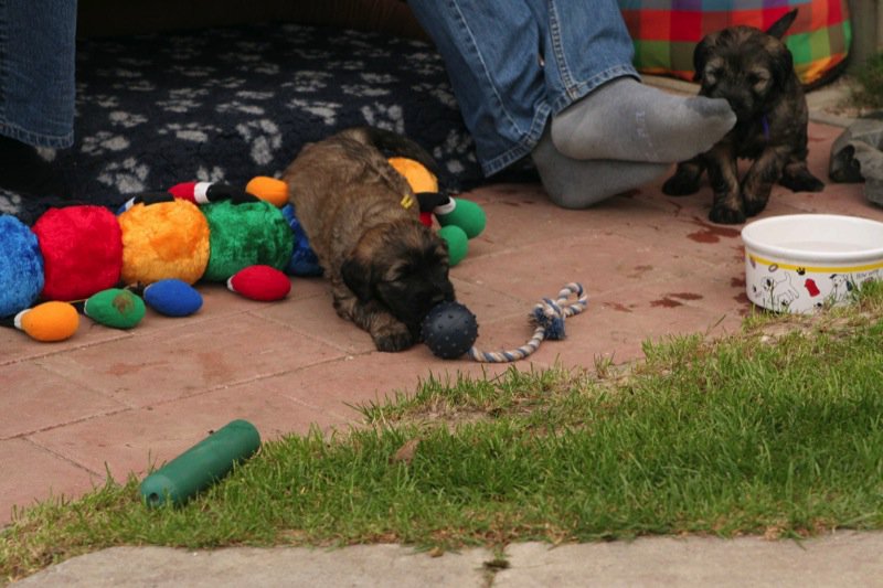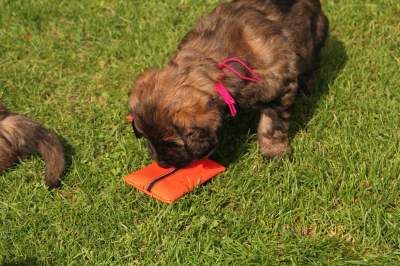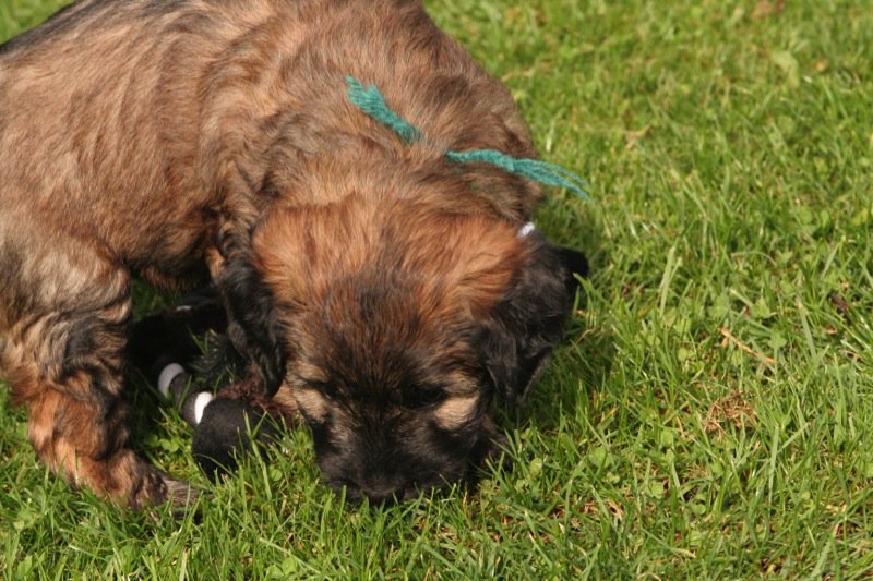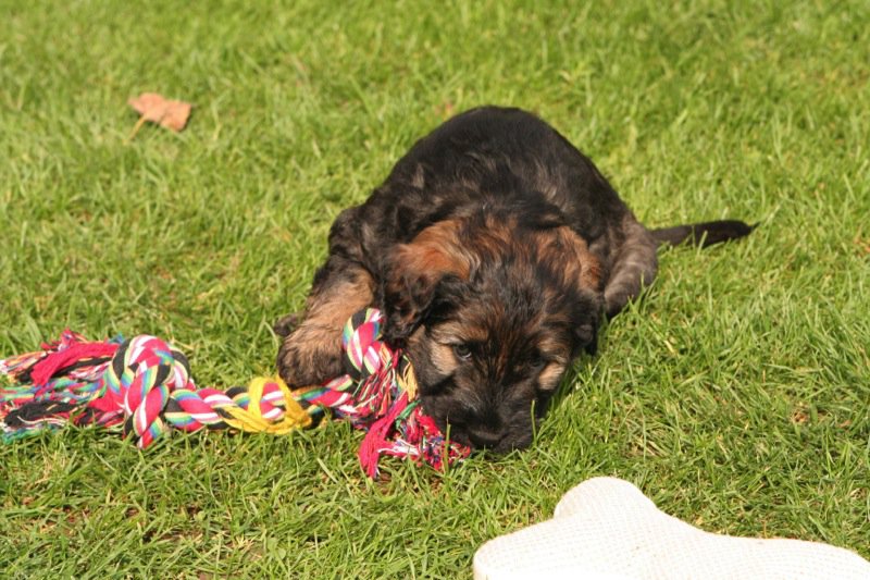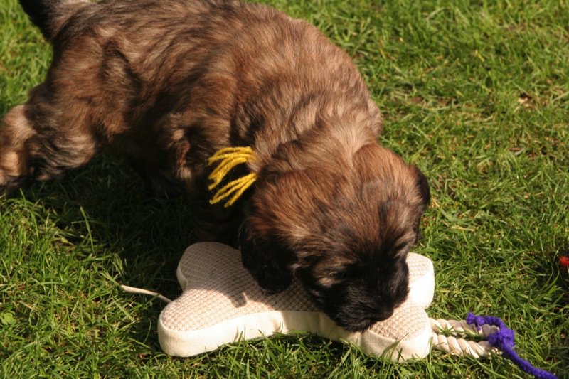 Was sich bei den Briardhexlein als zwar nicht einfach, aber doch machbar erwies, nämlich die Spielzeuge mit den entsprechenden Bändchen den Welpen für das Fotoshooting zuzuordnen, erweist sich bei unseren Gossos als ein fast undurchführbares Unterfangen. Alleine geht es gar nicht und so habe ich beim Fotografieren einfach genommen was ich so aufs Bild bekommen habe. So kamen dann ganz lustige Duos zusammen und alle waren zufrieden mit den eroberten Spielzeugen.