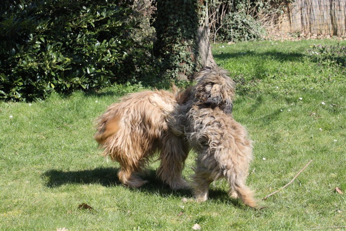 Und hatte ein paar supertolle Tage in der Pfalz. Neben spannenden, langen Spaziergängen (Rehe ohne Ende) mit dem größten Teil des Rudels, dösen und relaxen in der Sonne (war tatsächlich am Dienstag warm genug zum draußen sitzen), hatte sie täglich mit Pastis eine richtig gute Zeit. Als wenn sie nie zuvor was anders getan hätte, spielte sie hingebungsvoll mit ihm, ließ sich völlig unproblematisch decken, und döste 'danach' mit ihm auf der Wiese in trauter Zweisamkeit. Pastis konnte es gar nicht fassen, dass sie gleich nach dem Decken wieder mit ihm spielen und bei ihm liegen wollte.