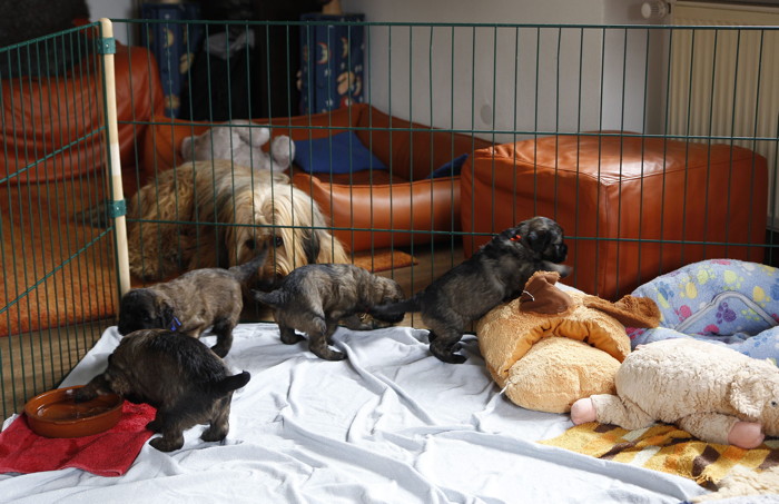 Abends kommen sie dann wieder zu uns in Wohnzimmer. Behaglich kuscheln sie sich nach einem aufregendem Spiel- und Eroberungstag in ihre Kissen und genießen unsere Streicheleinheiten ... bis sie am nächsten Morgen topfit und voller Tatendrang in ihr Welpenhaus umziehen, um neue Abenteuer zu erleben.