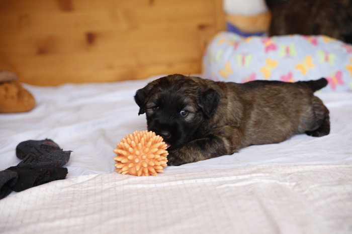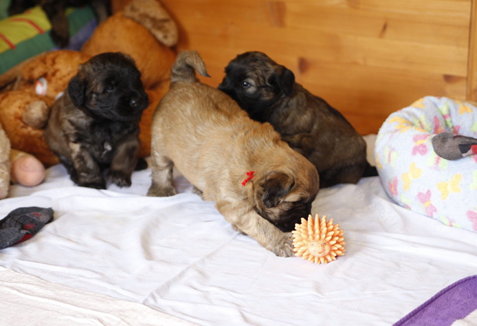 Die ersten vier Wochen sind geschafft und nun kann das turbulente Hexenhofleben beginnen. Die Spielphasen sind deutlich mehr und intensiver geworden, sie kommen sofort angelaufen wenn sie uns nur hören, fressen endlich auch ein wenig aus dem Napf und sind in ihr großes Welpenhaus sofort begeistert eingezogen.