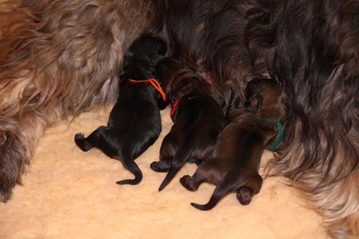 Cobold und ihr G-Wurf (fünf Bilder)- Cobold geht es supergut mit ihrem kleinen Wurf. Zufrieden kümmert sie sich hingebungsvoll um ihre Hexenkinder und lässt sich von uns standesgemäß verwöhnen.