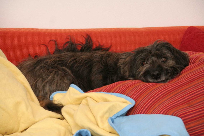 So, so, dieses Maskottchen soll größer sein als ich (acht Bilder)- Cobold ist mit ihren 3 Welpen mehr als relaxt, sie liegt total gerne bei ihnen, putzt und umsorgt sie und schleicht sich nur ab und an klammheimlich auf unsere Wohnzimmercouch! Nachdem ihr Andrea erlaubt hatte vor der Geburt auf der Couch zu 'hecheln', ist sie der Meinung, dass das nun ihr kleiner Thron ist. Witzigerweise ist sie - immer wenn ich reinkomme- bei ihren Welpen oder vor der Wurfhöhle. Nie auf der Couch, aber wer zerwühlt dann nur die ganzen Kissen und drapiert sie sorgfältig zum 'Nestchen' um? Der Verdacht liegt nahe, dass unsere Coboldine blitzartig und leise die Couch sofort verlässt, wenn sich jemand (meist ich) dem Wohnzimmer auch nur nähert. Sie macht ihrem Namen wirklich alle Ehre!