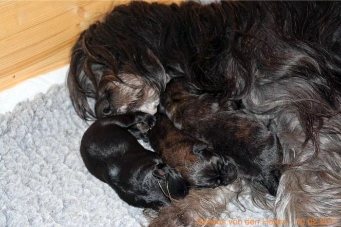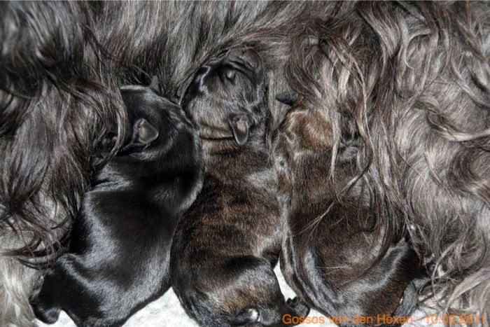 Unser Urmelchen hat endlich Ihre Welpen bekommen. Da es nur drei Hexlein sind, hat sie sich mit der Geburt ein wenig Zeit gelassen und uns noch bis Dienstag abend 'zappeln' lassen. Zwei Rüden und eine Hündin, alle schon 'fast abgabebereit', liegen wie kleine Nilpferde in der Wurfkiste und lassen es sich gut gehen. Mit Geburtsgewichten von 530g und darüber zählen sie sicherlich zu den Schwergewichten. Sie leben wie 'Gott in Frankreich' und wiegen jetzt nach zwei Tagen um die 750g! Wo soll das nur enden? Da auch wir zu den zukünftigen Besitzern eines 'Nilpferdchens' zählen, sparen wir am besten schon für das Futter.