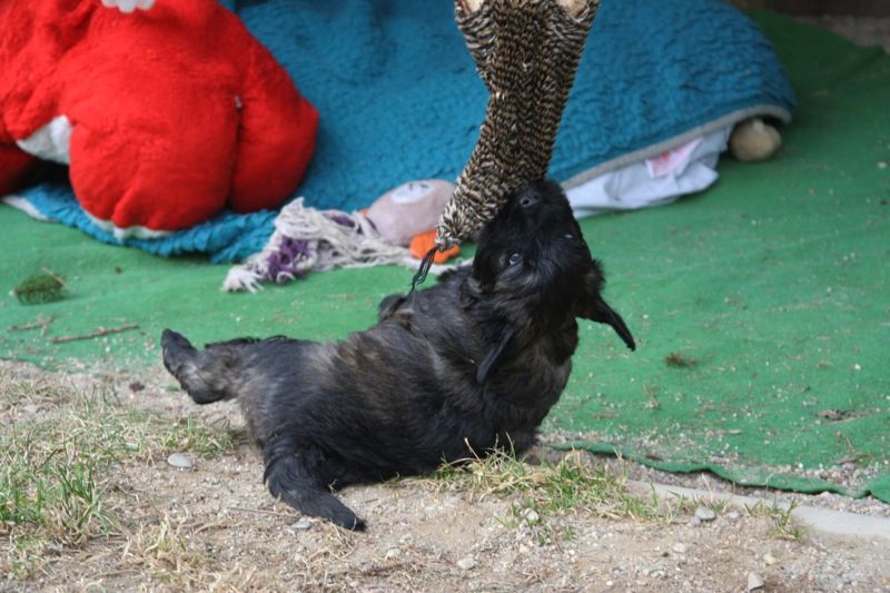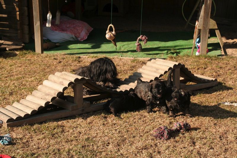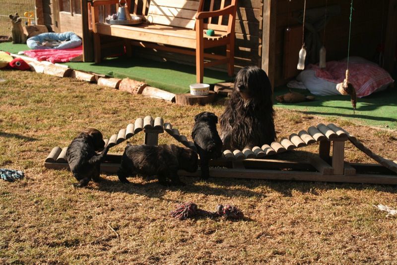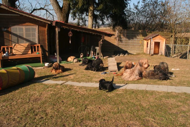 Unsere Kleinfamilie ist umgezogen. Nachdem ihnen unser Wohnzimmer ein wenig 'erlebnislos' vorkam, sind sie tagsüber in ihre 'Villa' mit Grünanlage und Erlebnispark gezogen. Und sie sind überglücklich beim Entdecken von unzähligen fressbaren Dingen, beim überprüfen von Spielzeug auf Unkaputtbarkeit, bei etlichen Kletterversuchen und beim Herumtoben mit Kobold und Onawa.
