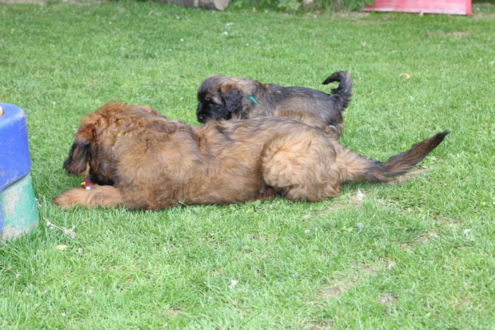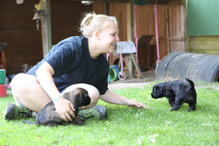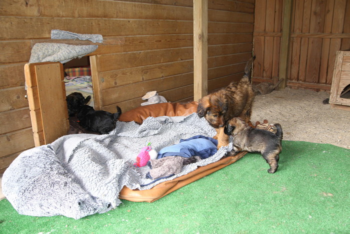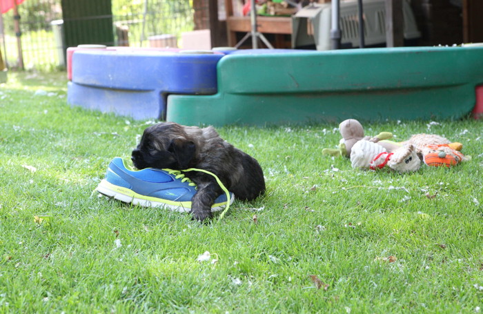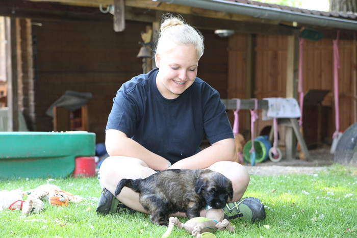 Unterstützt werden sie von unserer kleinen Umay. Umay, unser Nesthäkchen, ist völlig im Glück. Endlich hat sie Untertanen. Mit erhobener Rute stolziert sie im Welpengehege herum um Sekunden später mit den kleinen Musketieren zu toben. Nix ist mehr mit Königin, spielen macht doch mehr Spaß als wichtig sein.