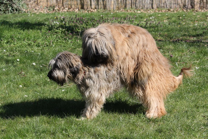 Und hatte ein paar supertolle Tage in der Pfalz. Neben spannenden, langen Spaziergängen (Rehe ohne Ende) mit dem größten Teil des Rudels, dösen und relaxen in der Sonne (war tatsächlich am Dienstag warm genug zum draußen sitzen), hatte sie täglich mit Pastis eine richtig gute Zeit. Als wenn sie nie zuvor was anders getan hätte, spielte sie hingebungsvoll mit ihm, ließ sich völlig unproblematisch decken, und döste 'danach' mit ihm auf der Wiese in trauter Zweisamkeit. Pastis konnte es gar nicht fassen, dass sie gleich nach dem Decken wieder mit ihm spielen und bei ihm liegen wollte.