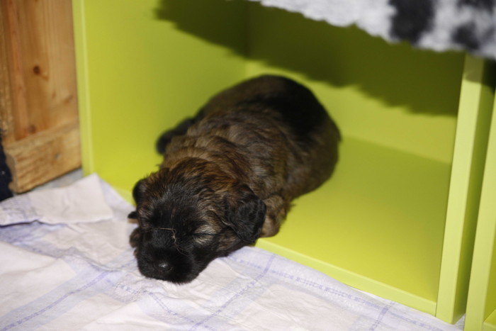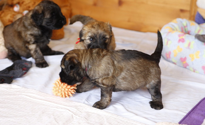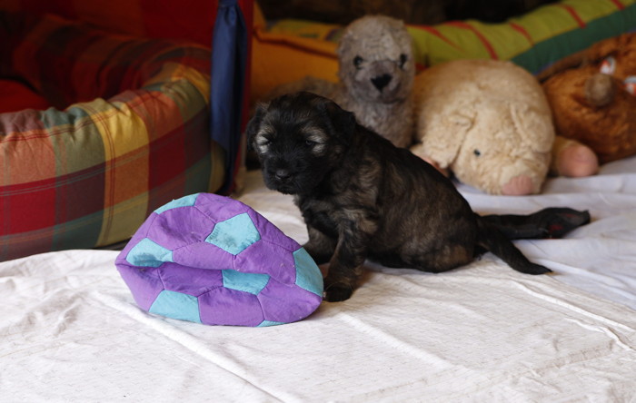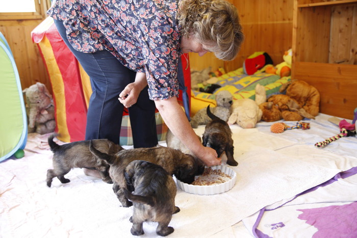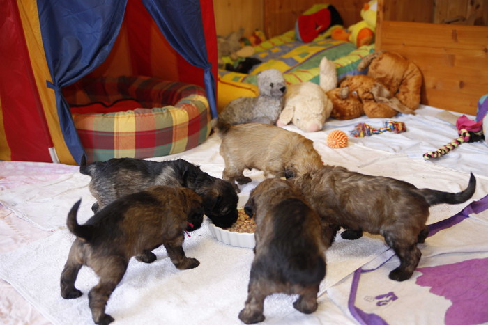 Die ersten vier Wochen sind geschafft und nun kann das turbulente Hexenhofleben beginnen. Die Spielphasen sind deutlich mehr und intensiver geworden, sie kommen sofort angelaufen wenn sie uns nur hören, fressen endlich auch ein wenig aus dem Napf und sind in ihr großes Welpenhaus sofort begeistert eingezogen.