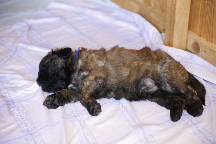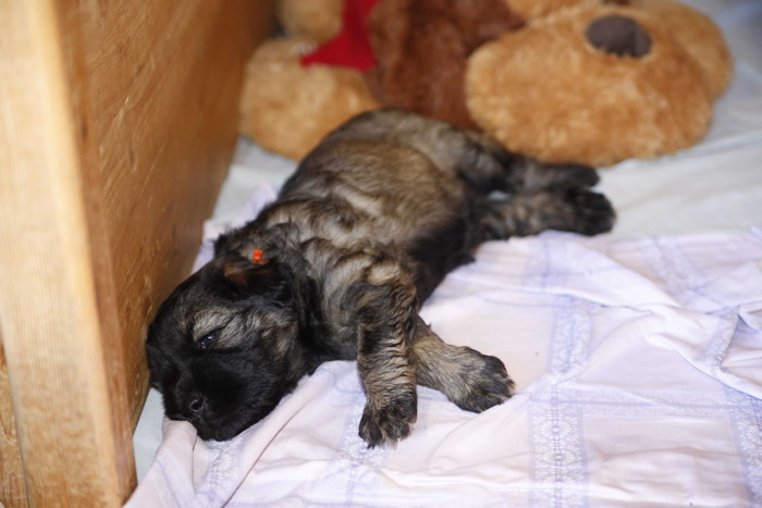 Abends kommen sie dann wieder zu uns in Wohnzimmer. Behaglich kuscheln sie sich nach einem aufregendem Spiel- und Eroberungstag in ihre Kissen und genießen unsere Streicheleinheiten ... bis sie am nächsten Morgen topfit und voller Tatendrang in ihr Welpenhaus umziehen, um neue Abenteuer zu erleben.