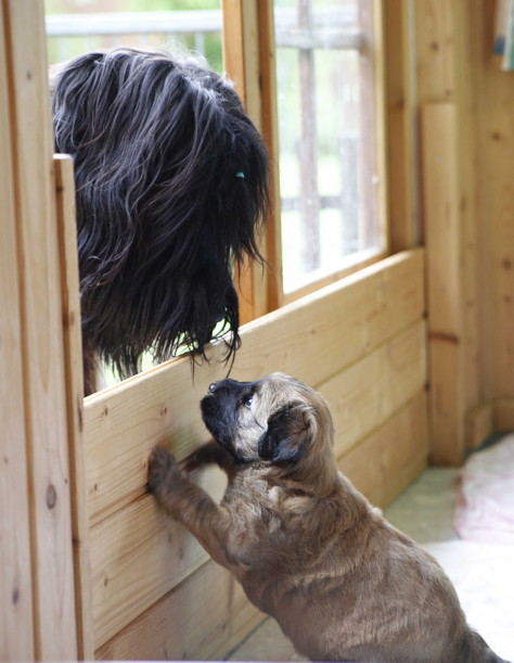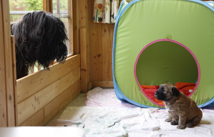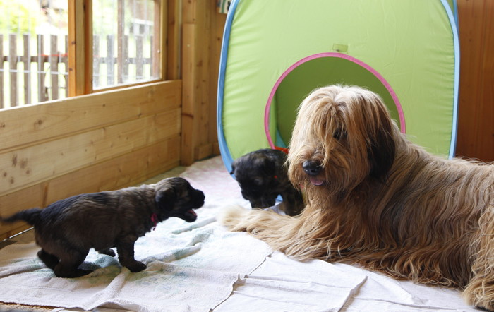 Trolli fand die Idee nicht soooo gut, konnten Yumay und Mimi endlich die Welpen näher beschauen. Yumay dagegen ist im Welpenglück. Wenn sie dürfte würde sie nonstop im Welpenhaus bei 'ihren' Welpen liegen. Mimi ist noch ein wenig vorsichtiger und schaut nur von der Türe aus zu. Obermama Troll kontrolliert alles sehr streng und passt auf, dass die Ruhezeiten unbedingt eingehalten werden. Noch immer säugt und putzt sie die Hexlein hingebungsvoll. Wir haben Mühe sie an den Futternapf zu bekommen, eigentlich schmeckt es bei Mama Troll immer noch am Besten.