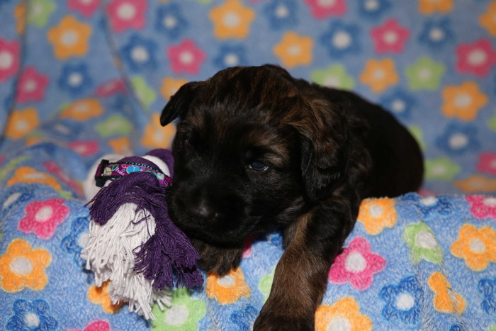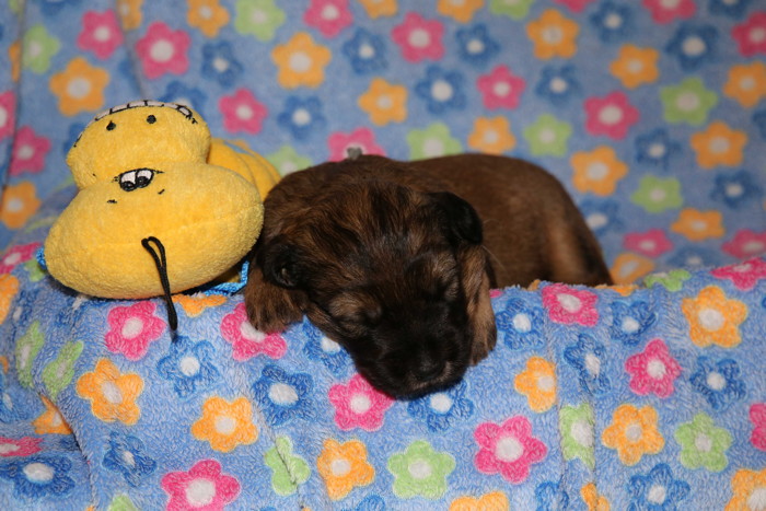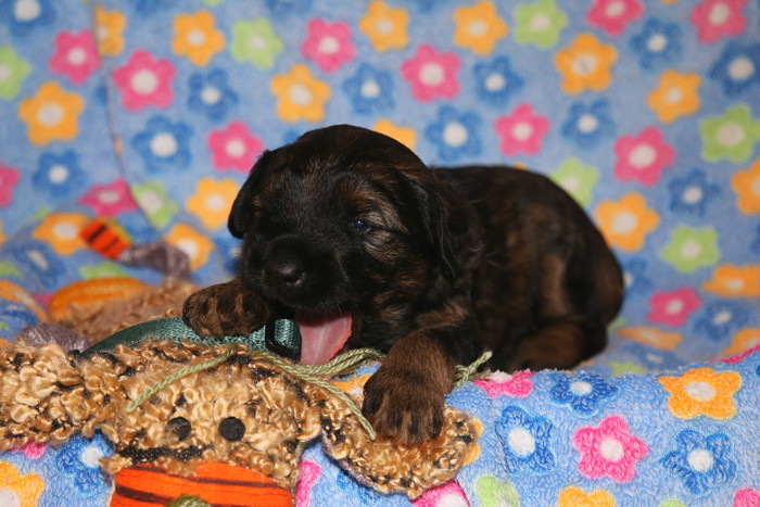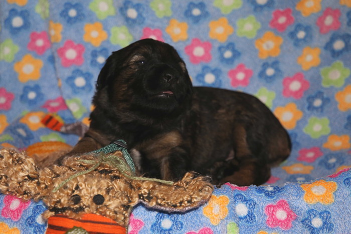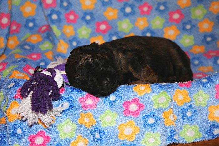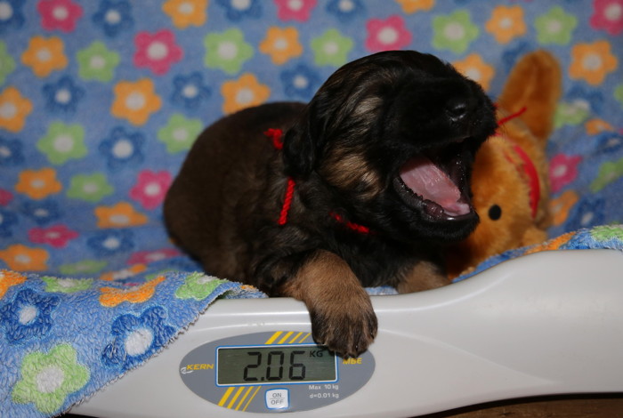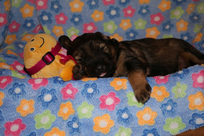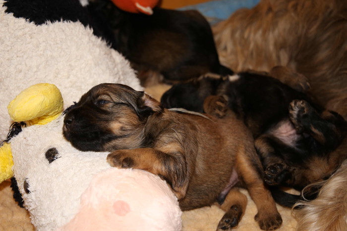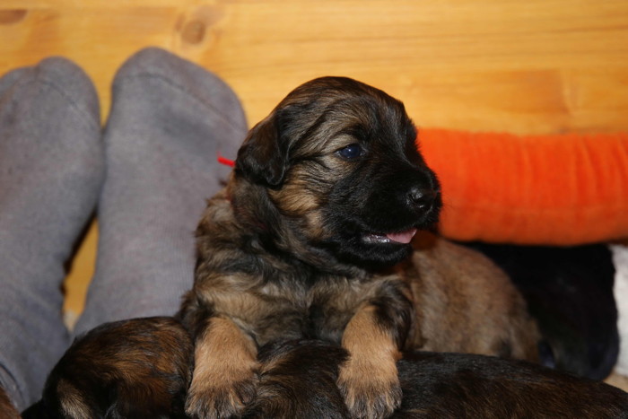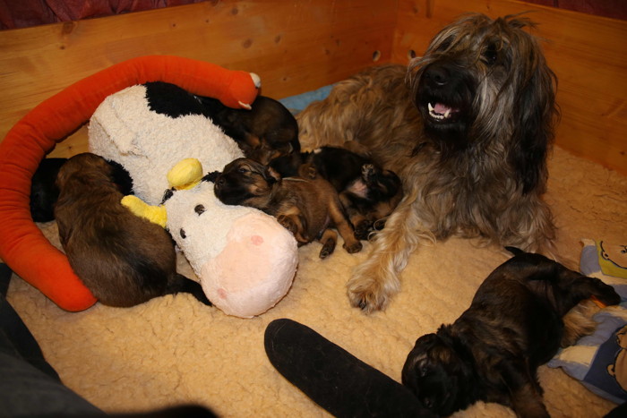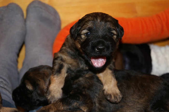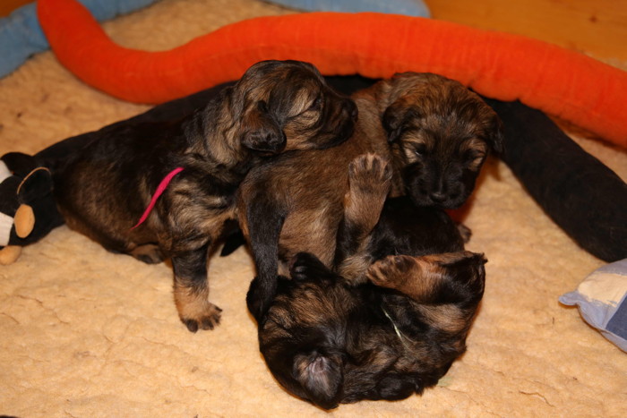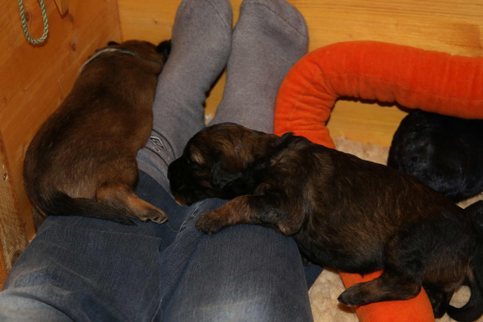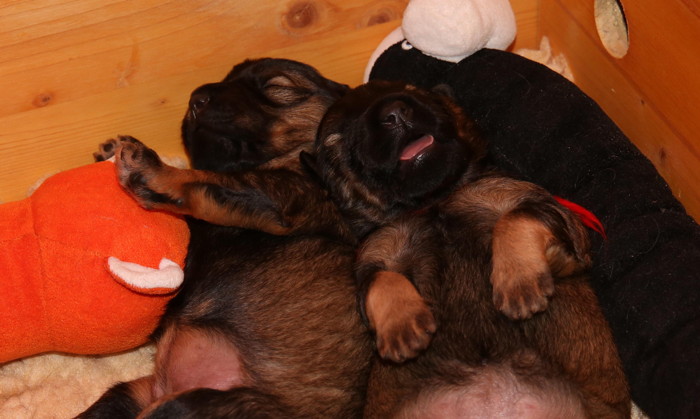 Mittlerweile laufen sie schon putzmunter :-)) in ihrer Höhle umeinander. Erste Spielattacken mit Mama Troll und uns finden nun regelmäßig statt. Auch hören sie uns schon und starten erste Bellversuche bei diversen Geräuschen.