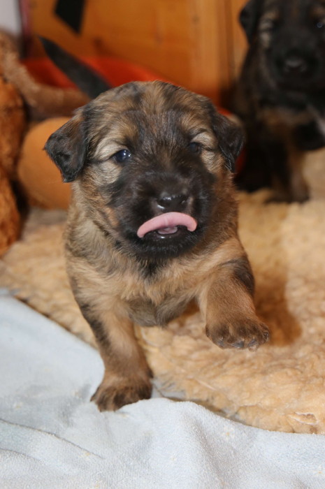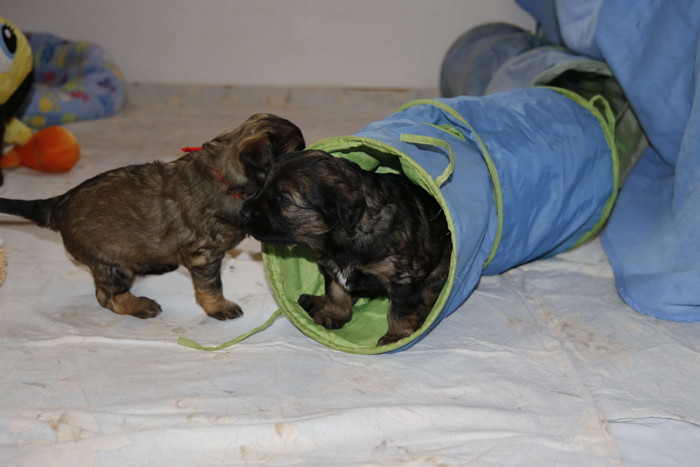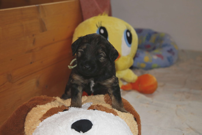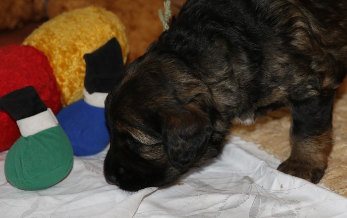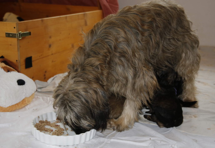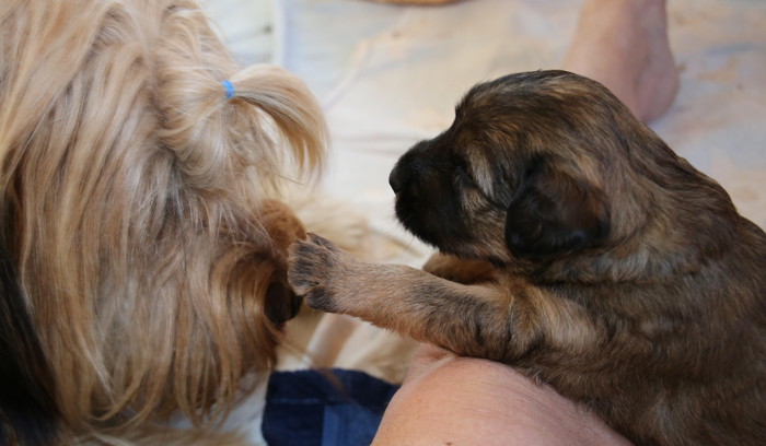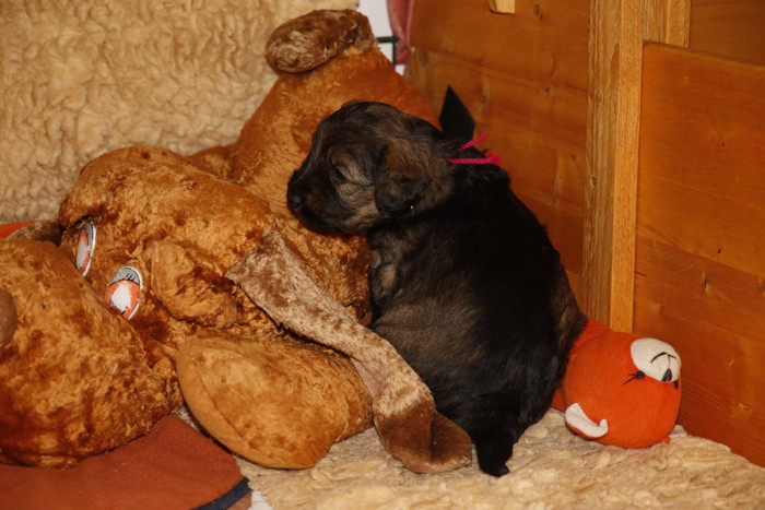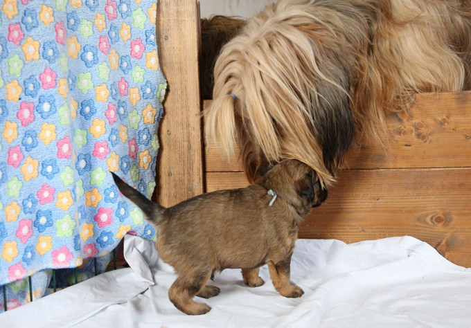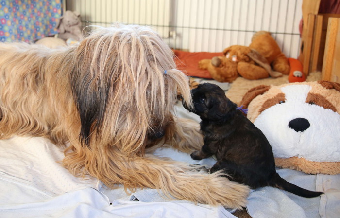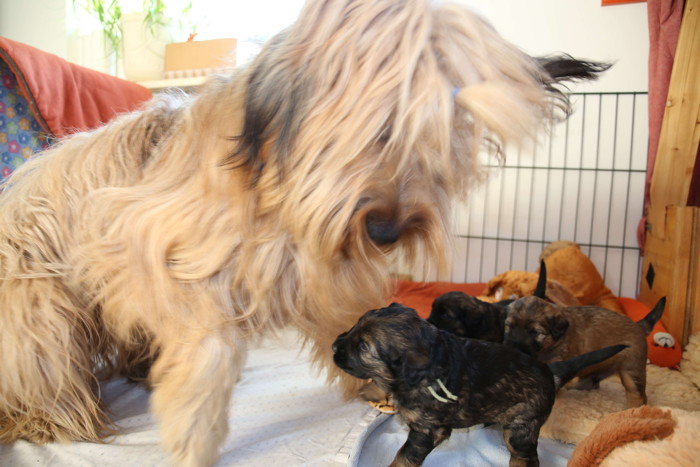 Endlich dürfen auch unsere anderen ein wenig im Wohnzimmer verweilen, obwohl Trolli sehr darauf achtet, dass niemand von den Vierbeinern sich dem Welpen zu arg nähert. Nur unsere Jüngste Umay darf die Nase ins Gehege stecken. Yumi war auch außer sich vor Glück, als sie in Abwesenheit von Troll zu 'ihren' Welpen durfte. Ganz vorsichtig lag sie zwischen den Hexenkindern und ließ alle auf sich herumturnen.