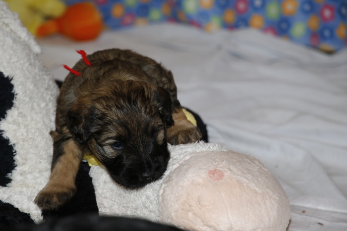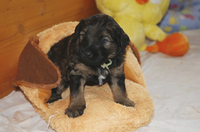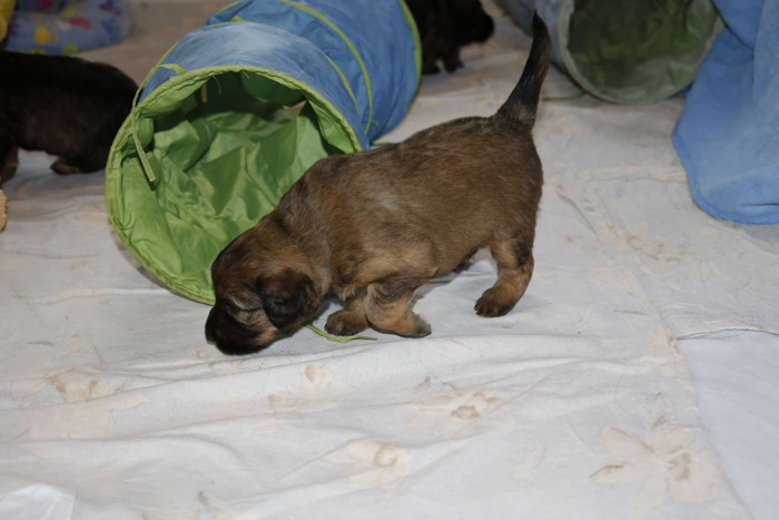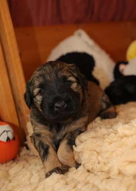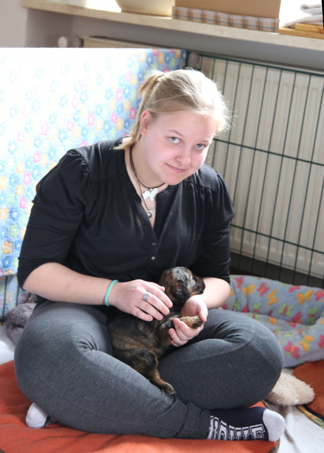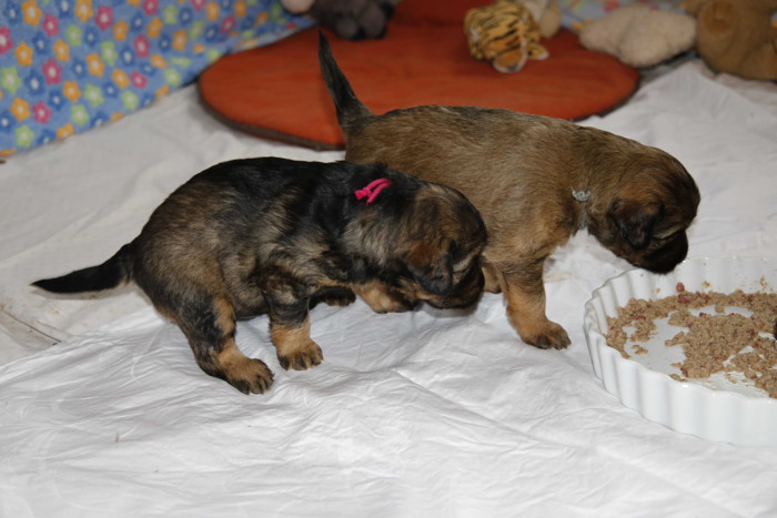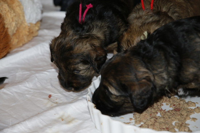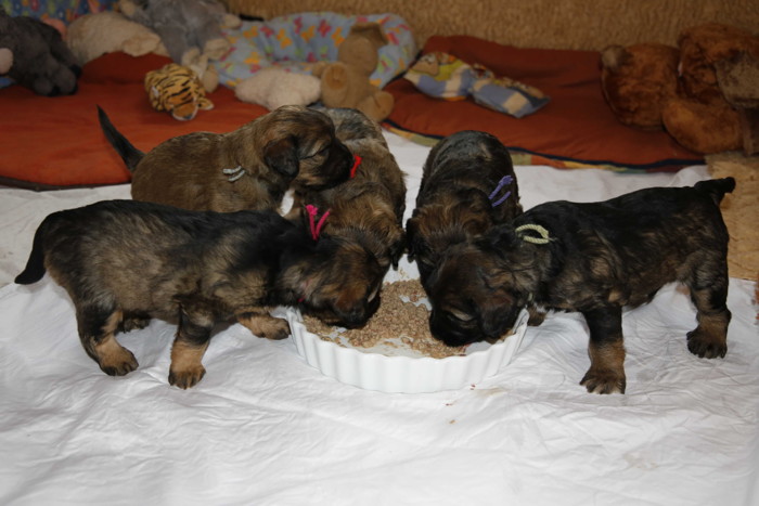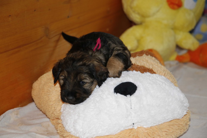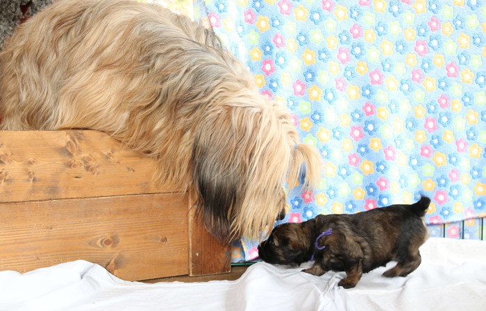 Endlich dürfen auch unsere anderen ein wenig im Wohnzimmer verweilen, obwohl Trolli sehr darauf achtet, dass niemand von den Vierbeinern sich dem Welpen zu arg nähert. Nur unsere Jüngste Umay darf die Nase ins Gehege stecken. Yumi war auch außer sich vor Glück, als sie in Abwesenheit von Troll zu 'ihren' Welpen durfte. Ganz vorsichtig lag sie zwischen den Hexenkindern und ließ alle auf sich herumturnen.